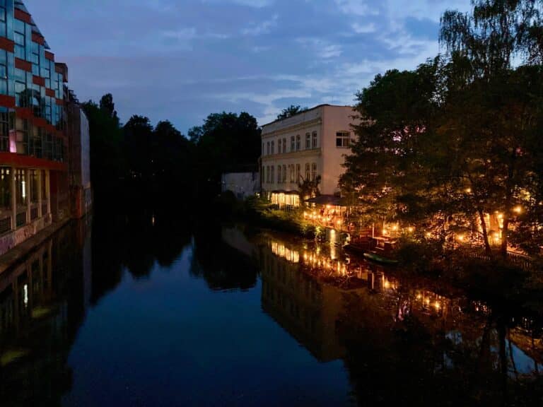 "Chapeau" in Hamburg is a bar with a huge, newly built terrace on a channel, a nice romantic spot next to the water with true local vibes.