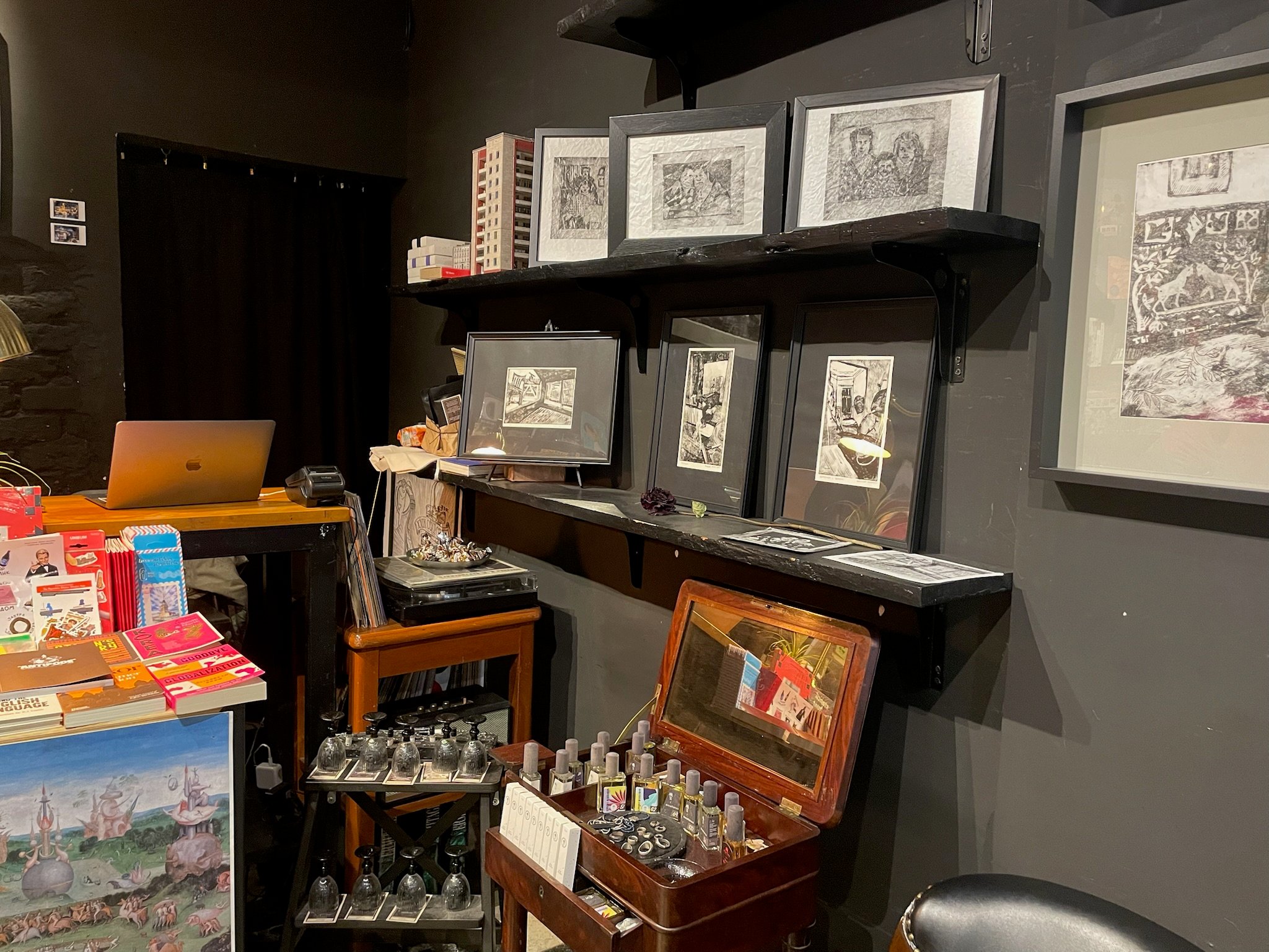 Various design objects are available for purchase along one side of the store. The carefully selected accessories, bookmarks, stationery items, and notebooks — all made by independent designers — add an enriched layer to the bookstore.