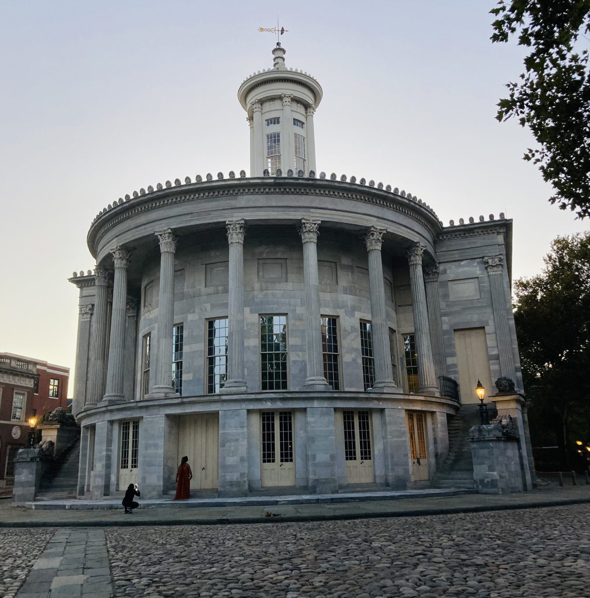 It was constructed with good old Pennsylvania blue marble (and Carrara marble columns). The front of the building facing 3rd Street, is masculine and stately while the back (at the triangle point on Dock and Walnut) is quite curvy and feminine which somehow achieves a lovely balance, especially with the cobblestone walkway beside it. There is just enough ornamentation to avoid ostentation, including detailed columns, a cupola with a golden weather vane and two lions guarding the back entrance.