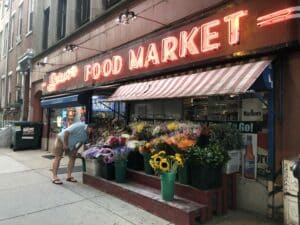 I love walking by in the evening when the sun is setting at the far end of Spruce Street and the neon starts to pop. There are always fresh flowers out front under the classic red and white striped awning, and sometimes a colorful display of fruits and veggies on the other side.