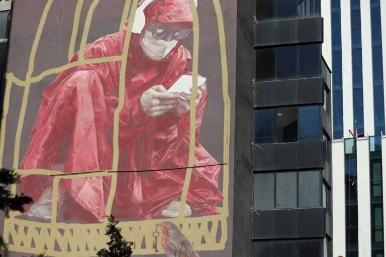 There are gigantic murals scattered throughout the city, each of them taking up the whole height and width of a building, each of them forcing you to halt.